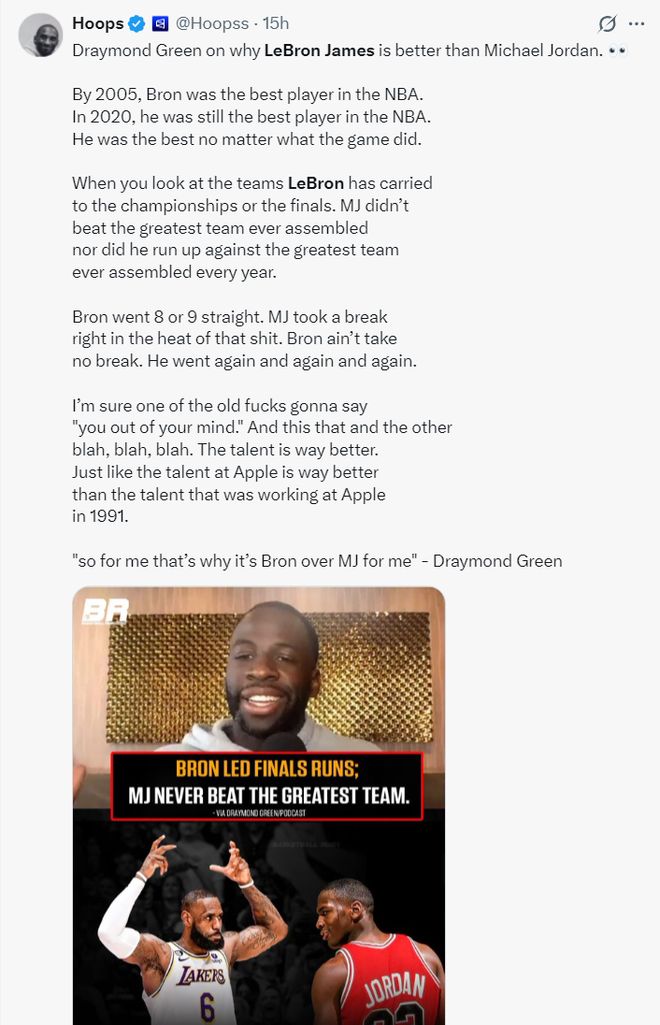 德雷蒙德-格林在个人播客节目中再度谈到自己觉得勒布朗-詹姆斯是强过迈克尔-乔丹的,他的理由有几点:(结论,对于我来说勒布朗就是强过乔丹,可能有人觉得我疯了)