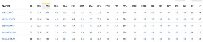 本赛季湖人有5人场均得分上双,詹姆斯场均16.1分7.6助攻4.7篮板0.7抢断0.3盖帽,命中率46.4%,三分命中率33.3%,正负值+1.7,他是球队的第三得分点,这位41岁的老将这数据不差吧?
