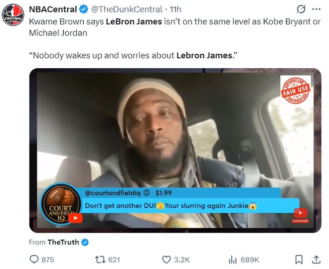 相信大家也看到了NBA历史最水状元夸梅-布朗的播客节目,他说詹姆斯不如科比、乔丹,因为没人惧怕勒布朗。他一直都觉得勒布朗不是关键先生,他没有乔丹、科比的杀手本质。