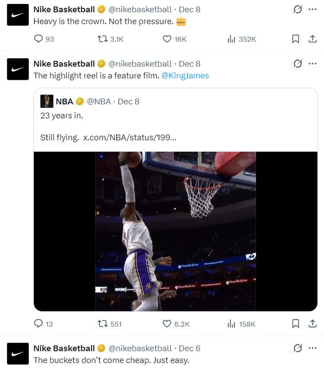 实际上即将年满41岁的勒布朗刚刚打出赛季最强一战,他在12月8日击败费城的比赛中拿到29+7+6+1+1的数据,而且在决胜时刻连拿10分帮助湖人取胜,Nike官方写道:欲戴皇冠必先承其重。大家应该可以清楚这句话的含义。